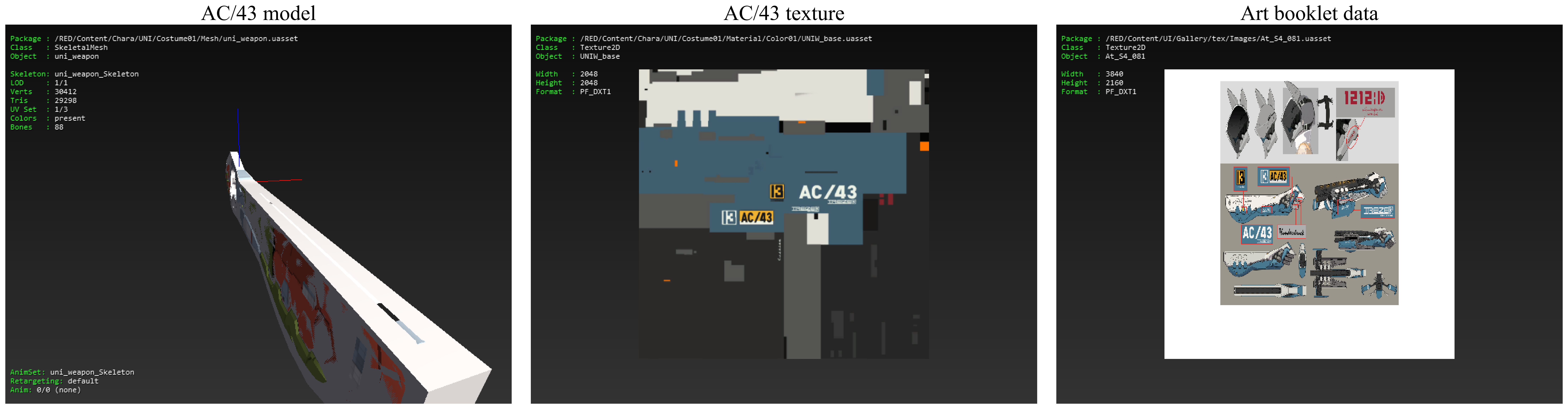 首先是素材部分,由于游戏中有着现成的模型和设计图可以参考,因此只需要进行解包获取源文件用来参考即可。d
